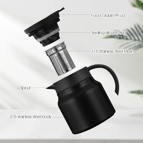Die Teekanne aus Edelstahl ist robust und hält Ihren Tee lange warm. Lebensmittelgeeigneter PP-Deckel, Dichtungsring aus Silikon, Topfkörper aus 316er Edelstahl, effiziente Isolierung, langlebig, V-förmiger Ausguss, der mit einer Hand gedrückt werden kann, damit Sie besser gießen können.