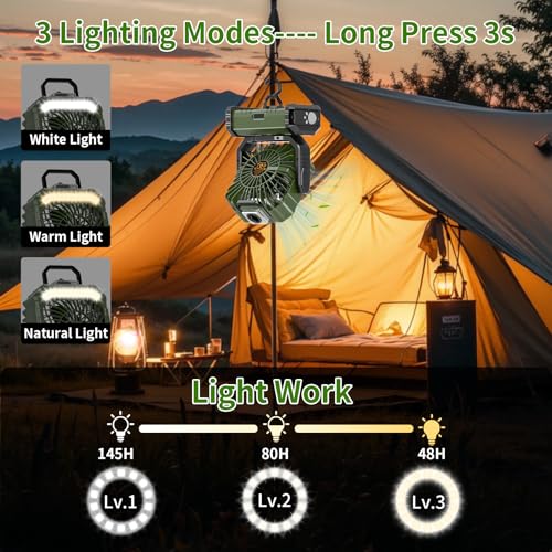 【Multifunktionales Design】Dieser Camping-Ventilator sondern hat auch 3 Helligkeitsstufen von LED-Licht, von weich bis hell, um Ihre Bedürfnisse zu erfüllen. Geeignet für wildes Camping und Wandern, oder Büro oder zu Hause. Unser Tischventilator kann um 270° gedreht werden, um eine kühle Brise in die von Ihnen gewünschte Richtung zu wehen. Der USB-Ventilator hat einen faltbaren Haken an der Unterseite, der an Bett, Zelt, Auto, Hängematte oder Baumzweig aufgehängt werden kann.
