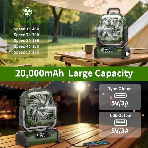 【20000mAh Wiederaufladbarer Ventilator】Der Campingventilator verfügt über einen integrierten 20000-mAh-Akku, der in 8–9 Stunden vollständig aufgeladen werden kann. Eingebauter 5V/3A-Typ-C-Eingangsanschluss zum Aufladen Lüfter sowie ein 5V/3A USB-Ausgang zur Stromversorgung anderer Geräte; Darüber hinaus unterstützt es das Arbeiten während des Ladevorgangs und wird während des Gebrauchs nicht heiß, was es zu einem guten Helfer beim den Schreibtisch, Bibliothek, auf Reisen, beim Picknick macht.