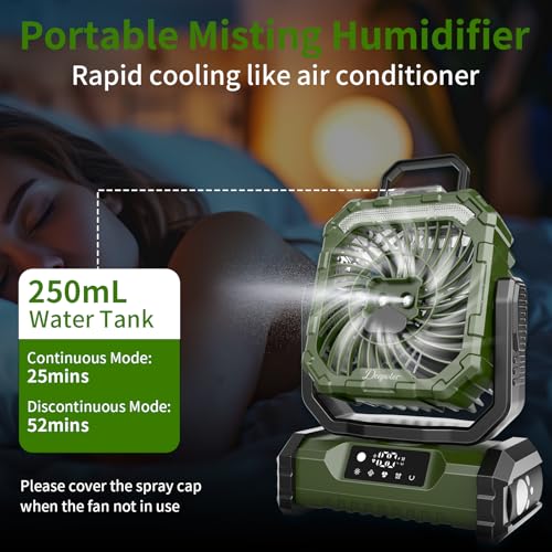 Camping Ventilator 20000mAh, Wiederaufladbarer Tischventilator USB Ventilator mit LED Licht & Haken, 270° Drehung mit Fernbedienung, Misting Fan für Outdoor, Zelt, Grillen, Strand – Grün