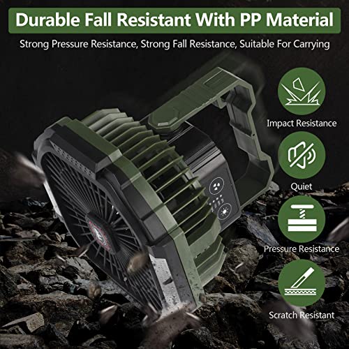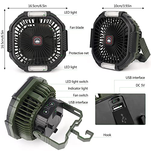 ZWOOS USB Camping Ventilator, 10400mAh Wiederaufladbar Tisch Wand/Leise Ventilator mit 4 Geschwindigkeitsstufen Verstellbaren Tischventilator mit LED-Licht für Outdoor Picknicks, Angeln